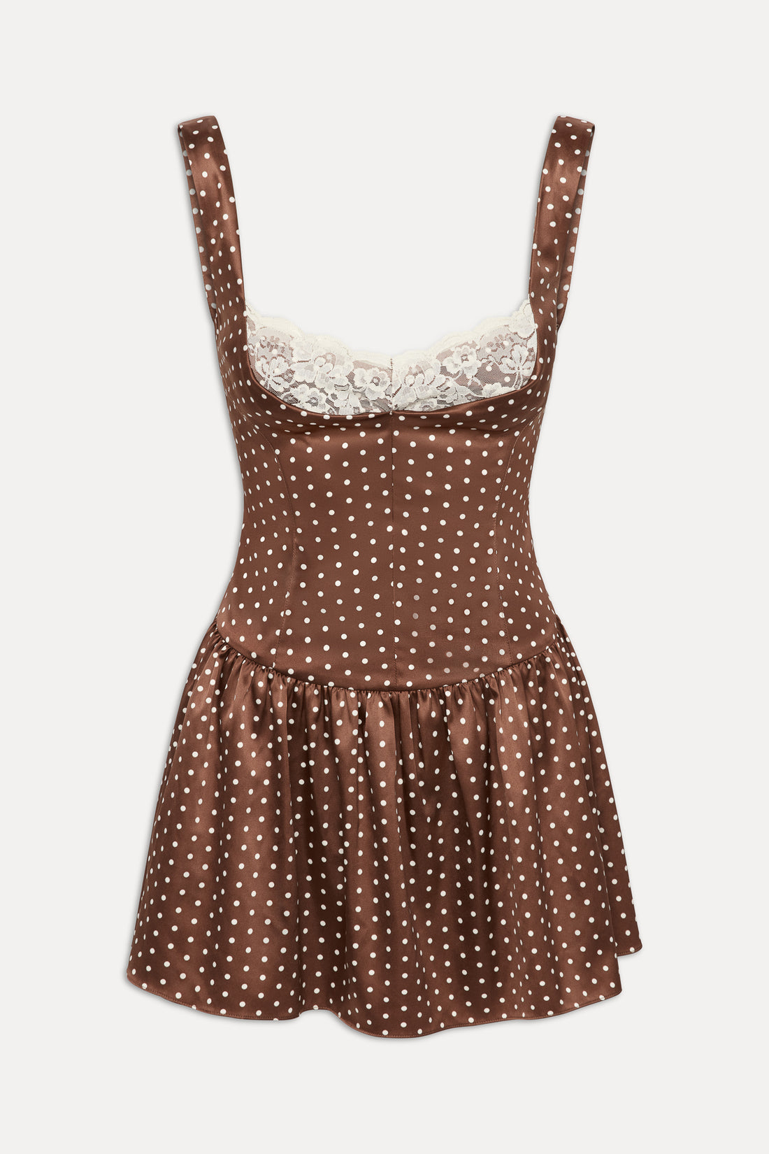 The Enchantment Sateen Mini Dress in Chocolate Dot shines subtly with wide straps, ivory lace bust detail, and a flouncy dropped waist skirt.