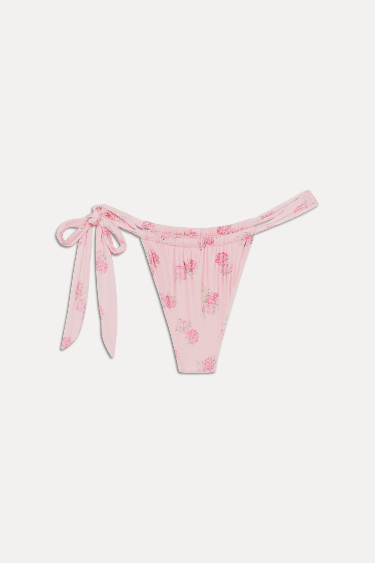 The Kealy Satin Bottom in Fresh Rose offers cheeky coverage with playful tie sides—perfect for your next tropical escape.