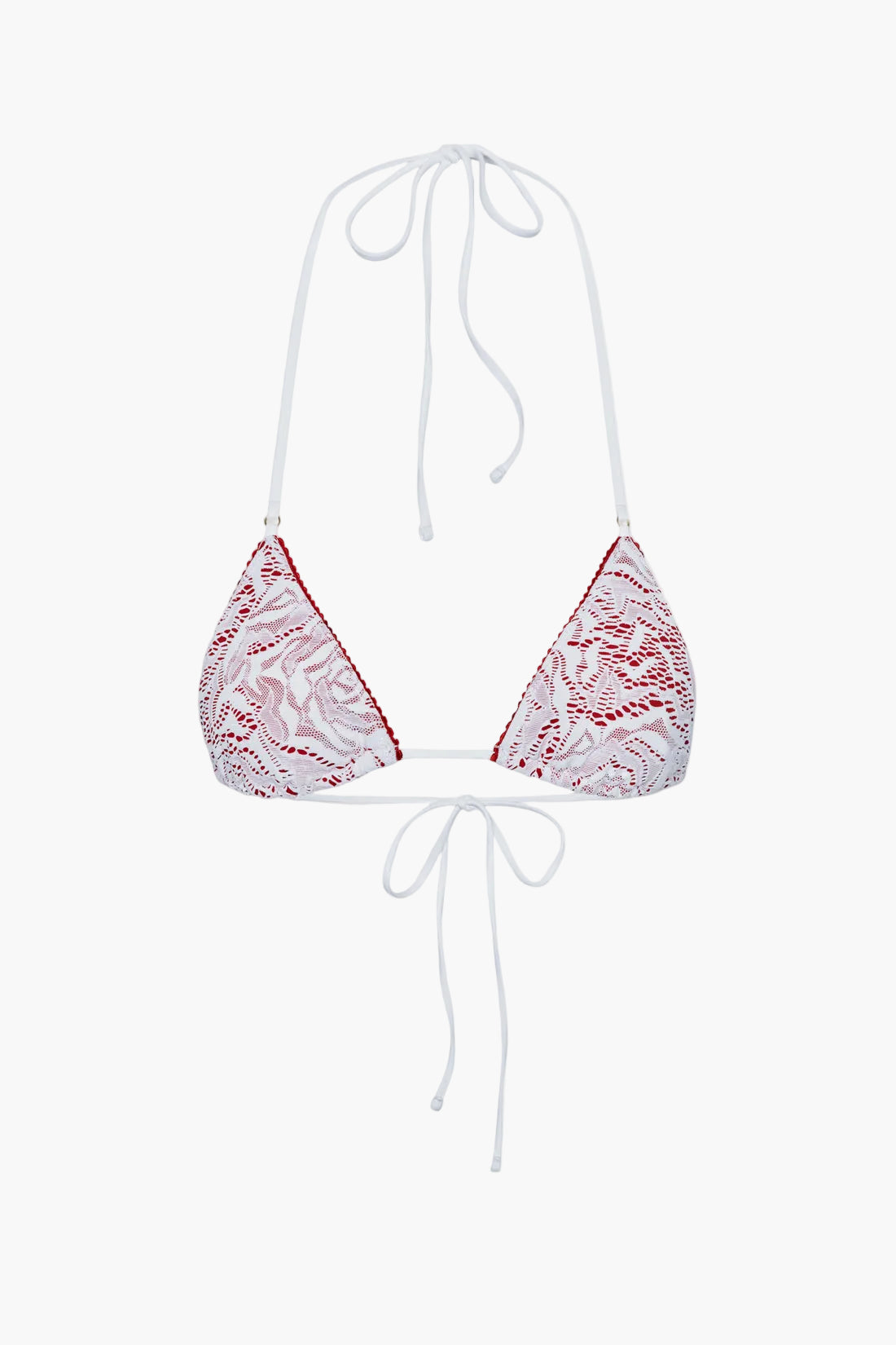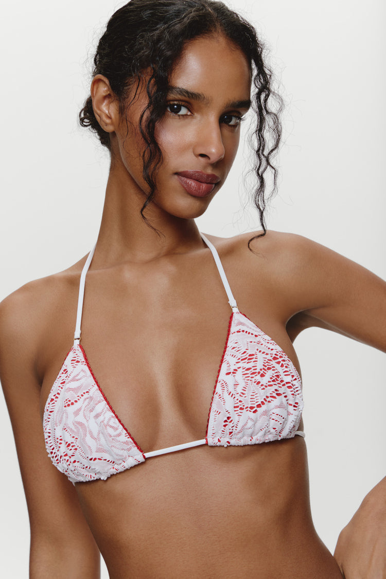 Halter bikini top featuring custom floral lace layered over swim fabric. Triangle coverage with neck and back ties. Ruched accents for flattering shape.