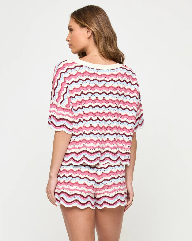 The Sunchaser Top is an effortless pick that looks perfect when paired with a bikini or the matching shorts. The cropped fit, colorful crochet knit, and scalloped hem and drawstring waist will have you reaching for it all the time.