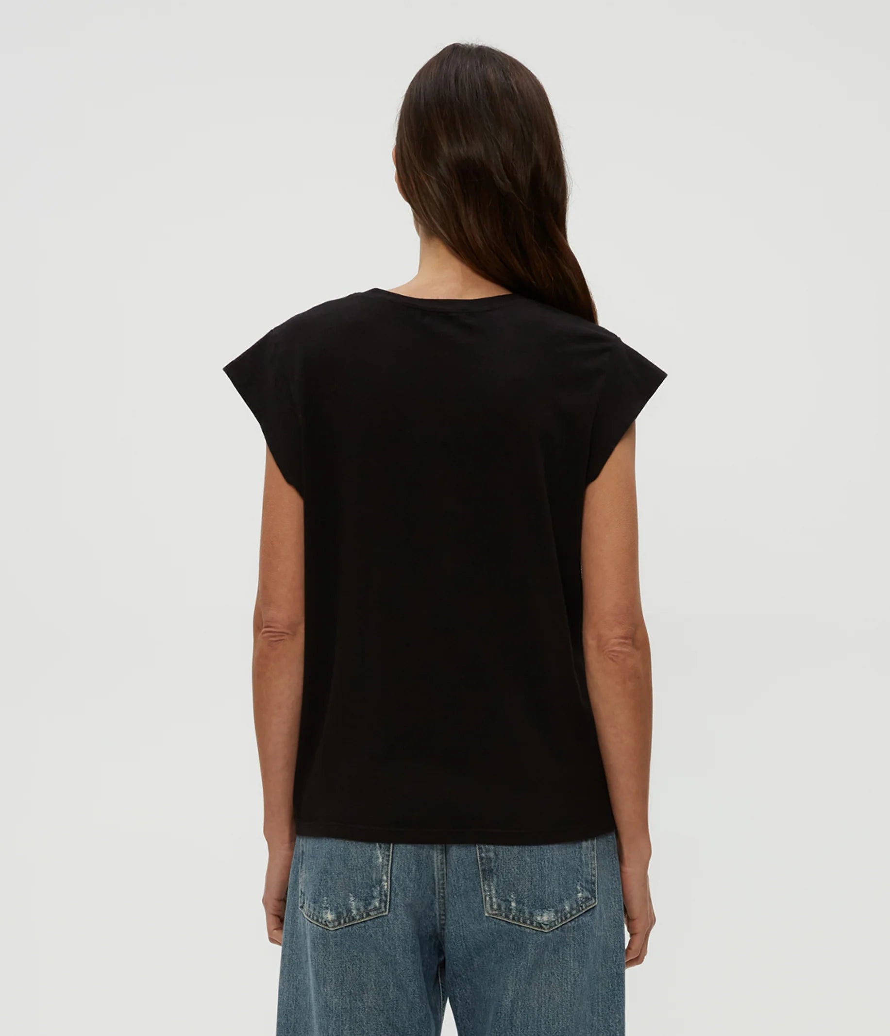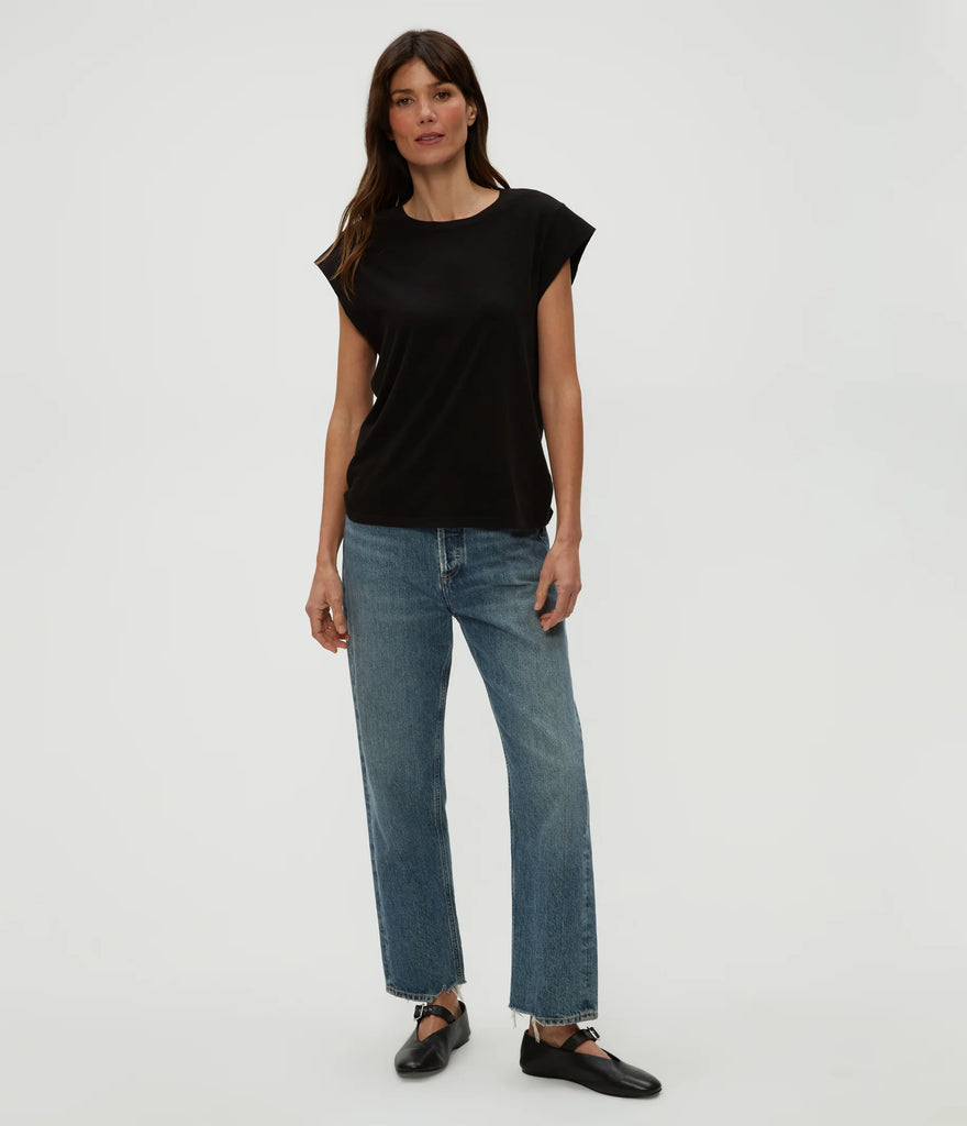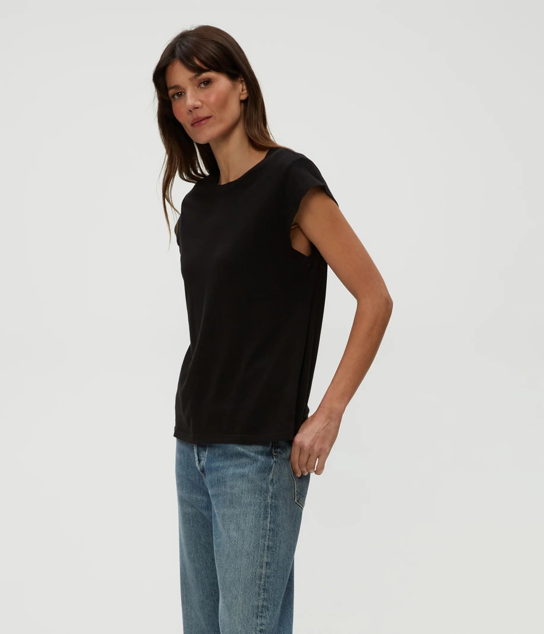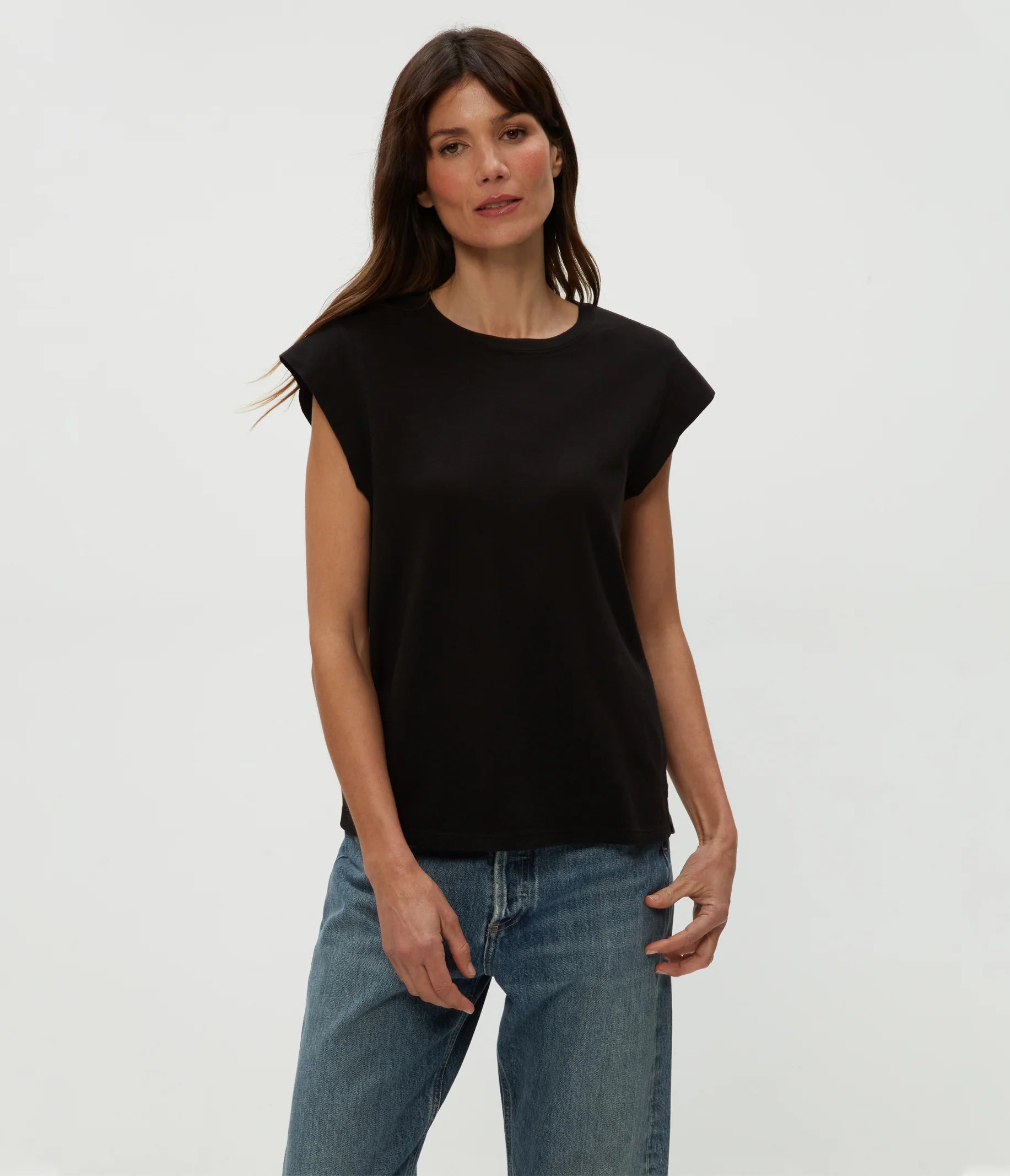 Give your wardrobe a boost with this power shoulder tee, boasting a crewneck and a bold, extended shoulder silhouette. It’s a fresh twist on the classic muscle tank, crafted from 100% cotton Vintage Jersey that's lightweight and feels wonderfully soft and broken-in.