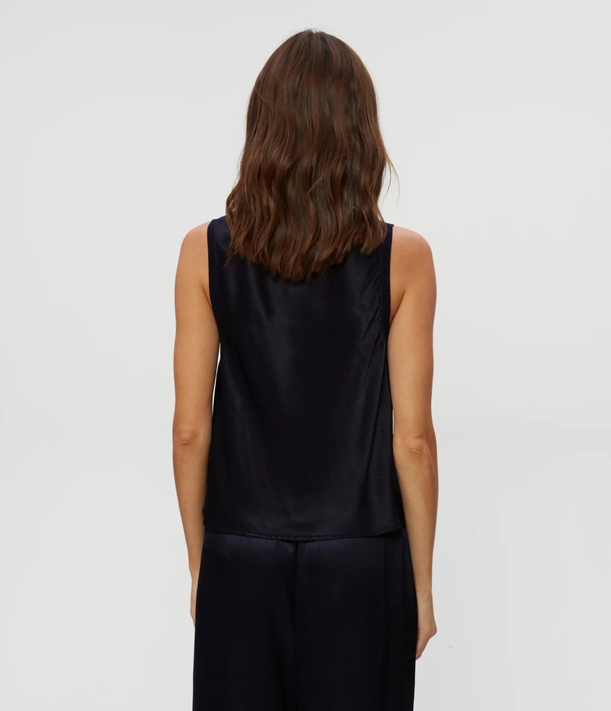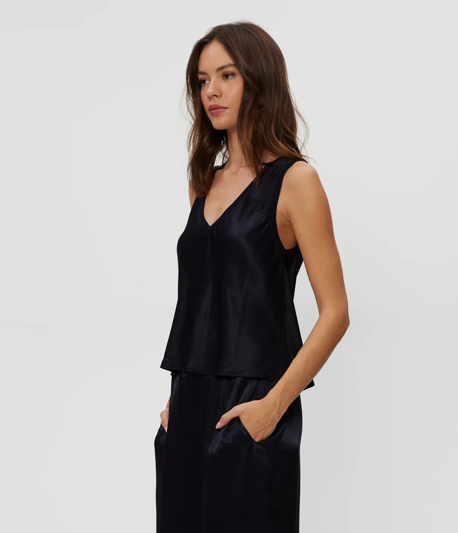 This washable satin tank is crafted with care and offers a silky, luxe feel. Its flowy design and relaxed fit make it a wardrobe staple. For a chic and effortless vibe, team it up with the Cyrus Pant or Pixie Jogger for that laid-back luxury style.