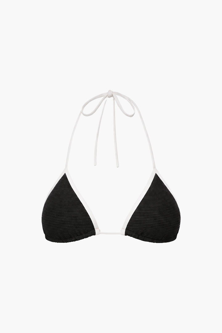 Noir triangle top with crisp white trim. Adjustable ties, snag-resistant Micro Rib fabric, light-to-moderate support. Elevated everyday elegance.