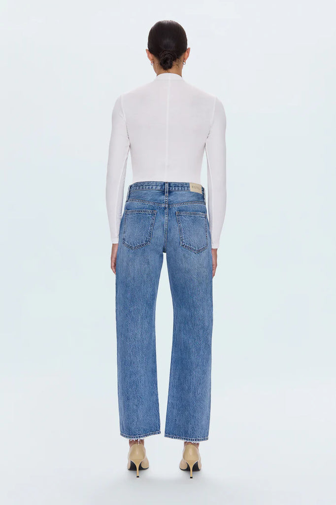 Our best-selling jean that understands proportion, Lexi features a mid-rise and bowed straight leg with a subtle curve through the knee for effortless shape. Finished with a 29" inseam and clean hem for a polished finish. Crafted from rigid denim in Metropolis, a medium indigo wash with authentic fading and whiskering that delivers lived-in character.