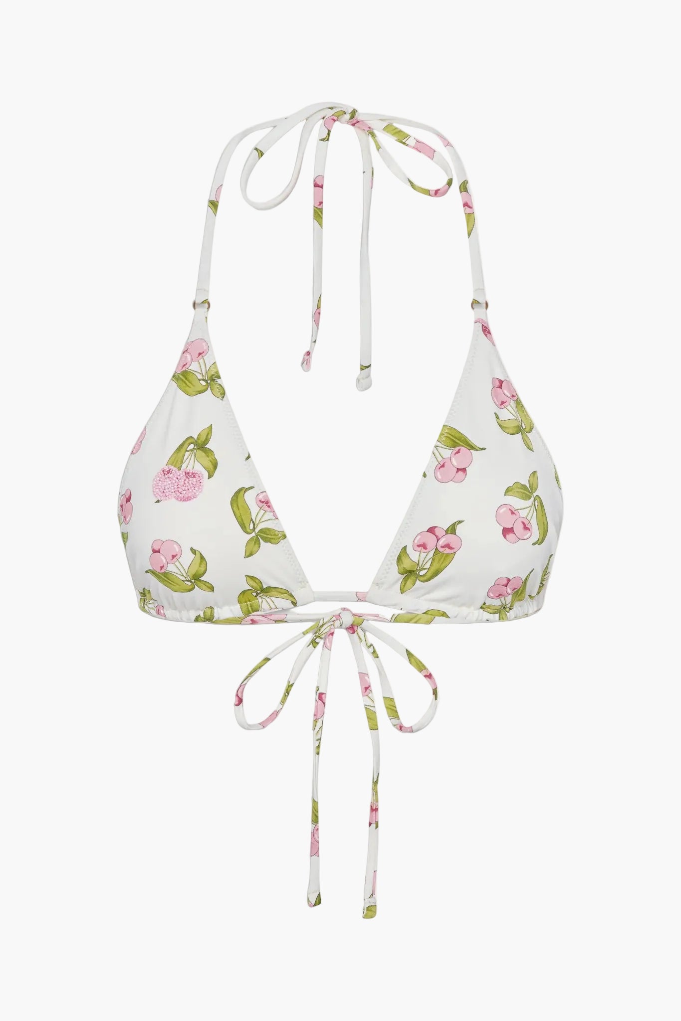 Turn heads in the Grace triangle bikini top, a sweet and supportive take on a timeless style. This medium coverage bikini top is finished with a cherry bead detail and our new fruit print, Cherry Picked.